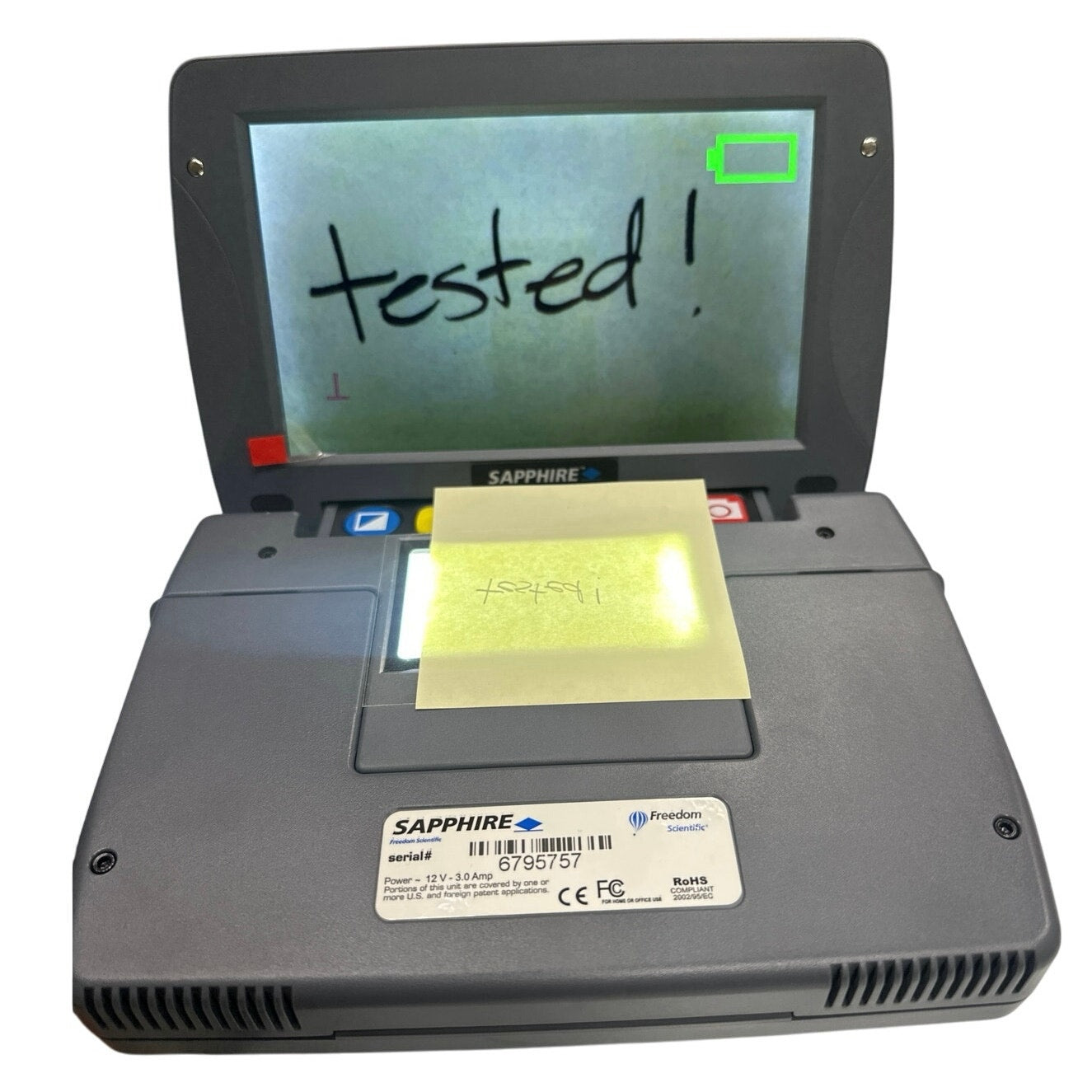 -Freedom Scientific Sapphire Magnifier, tested works power adapter included. Excellent condition pre owned. Magnifies images on screen where you can zoom in and capture a still picture. Has a couple different modes like black and white as well. Excellent for people with vision problems.