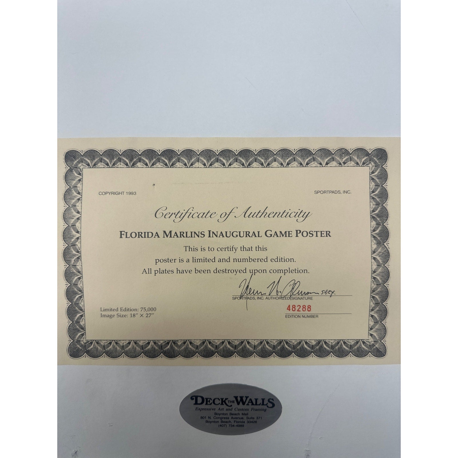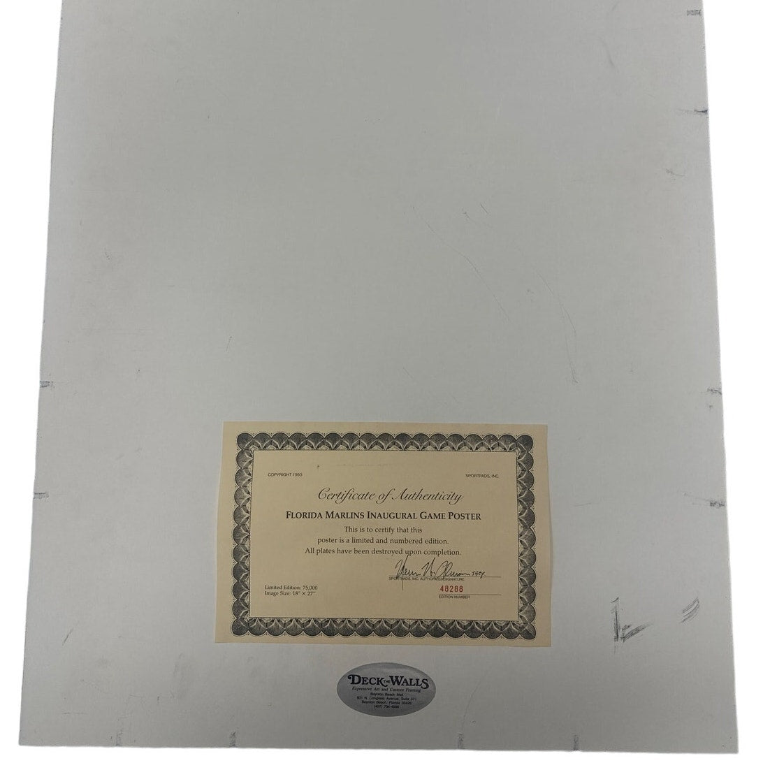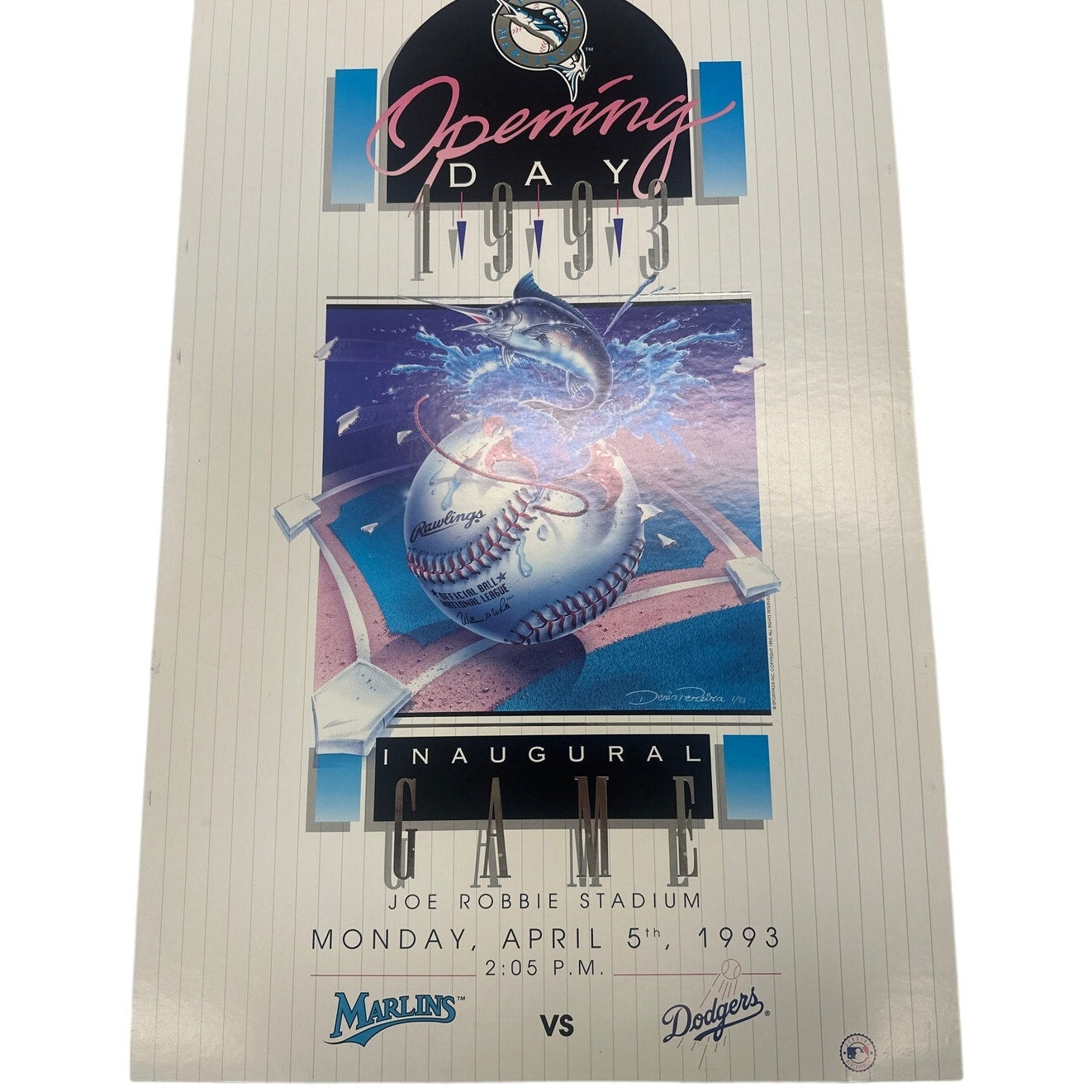 - Opening Day 1993 Inaugural poster and 3 pictures; including first pitch at Joe Robin Stadium. Marlins vs Dodgers. Poster is certified authentic as seen on pictures. 3 photo prints with some tape in the back. Please see attached pictures. All are in Excellent condition.