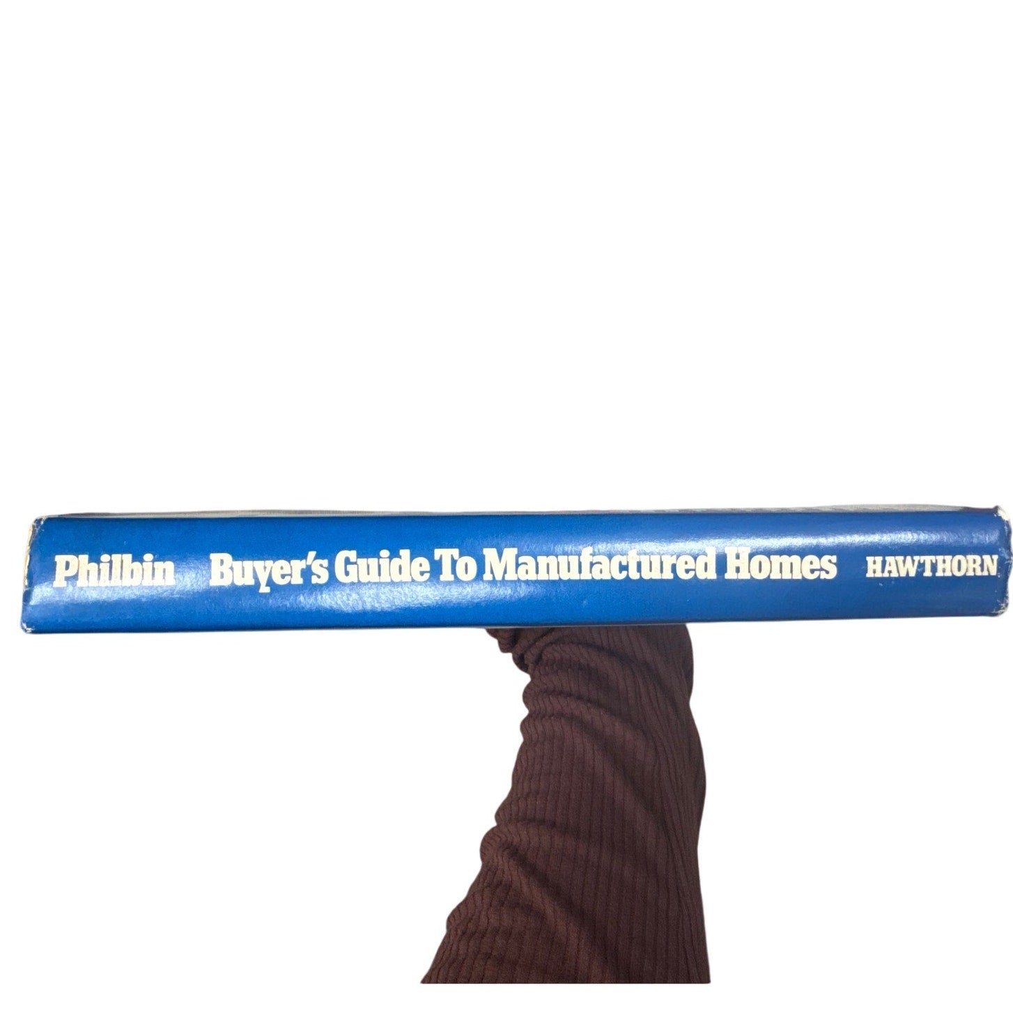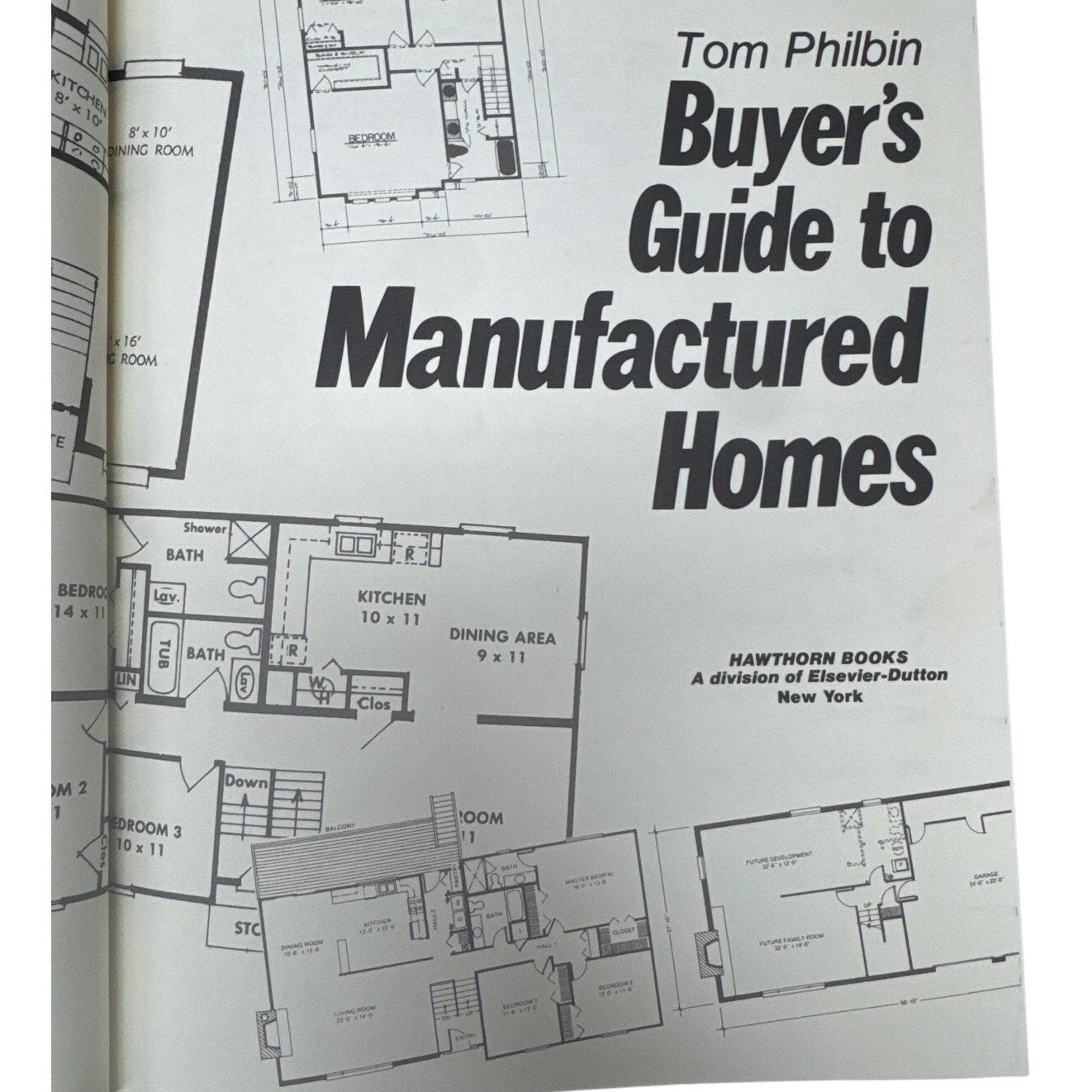 First Edition Buyer’s Guide to Manufactured Homes by Tom Philbin. ISBN 0-8015-0984-X. Dust jacket shows wear with faded blue and worn edges; inner flaps and hardcover edges have yellowing from age. Pages are clean with normal age toning; last section has heavier yellowing. No writing or tears noted. Great reference book for manufactured home layouts, buying tips, and construction info.