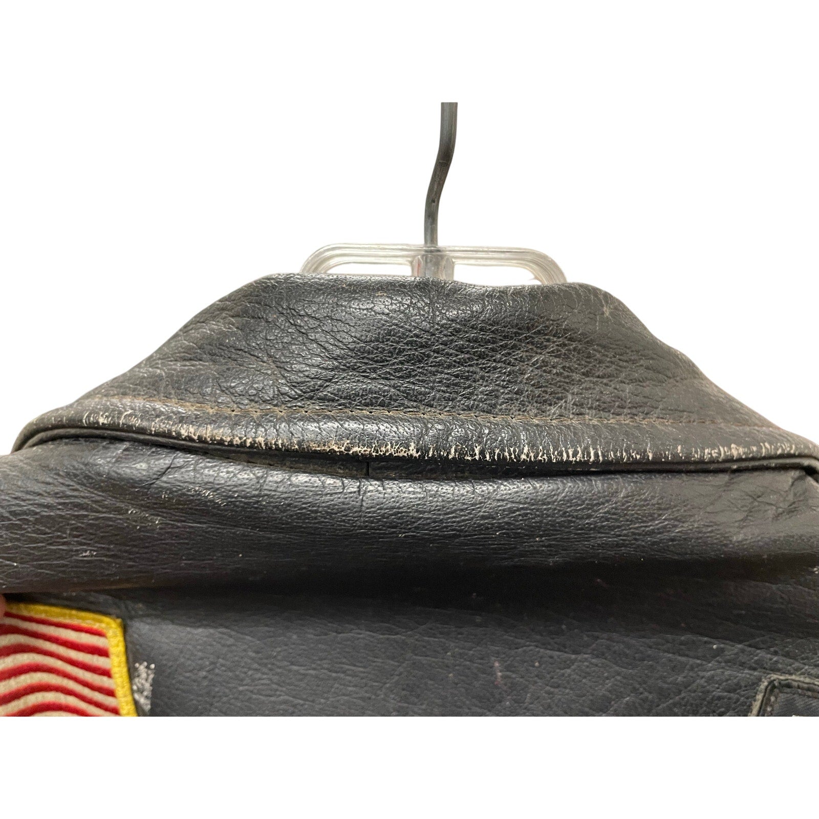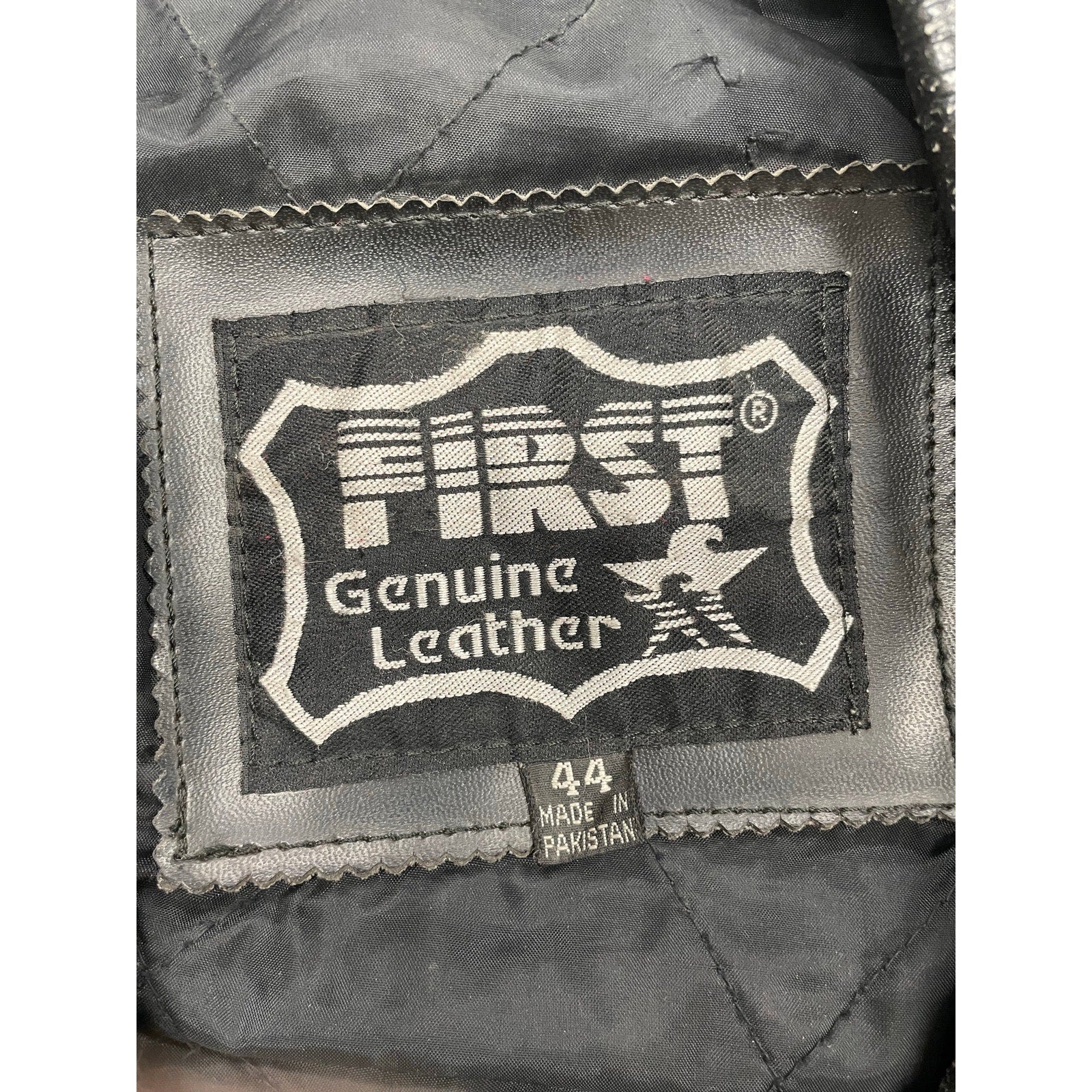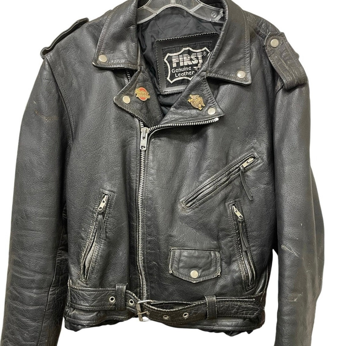 - A vintage First Genuine Leather Moto Jacket Size 44 black. Includes vintage Harley Davidson pins and patches. All zippers and snaps work.