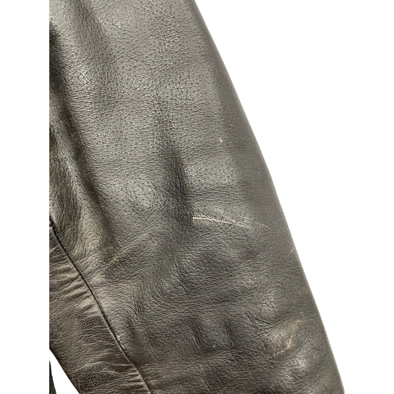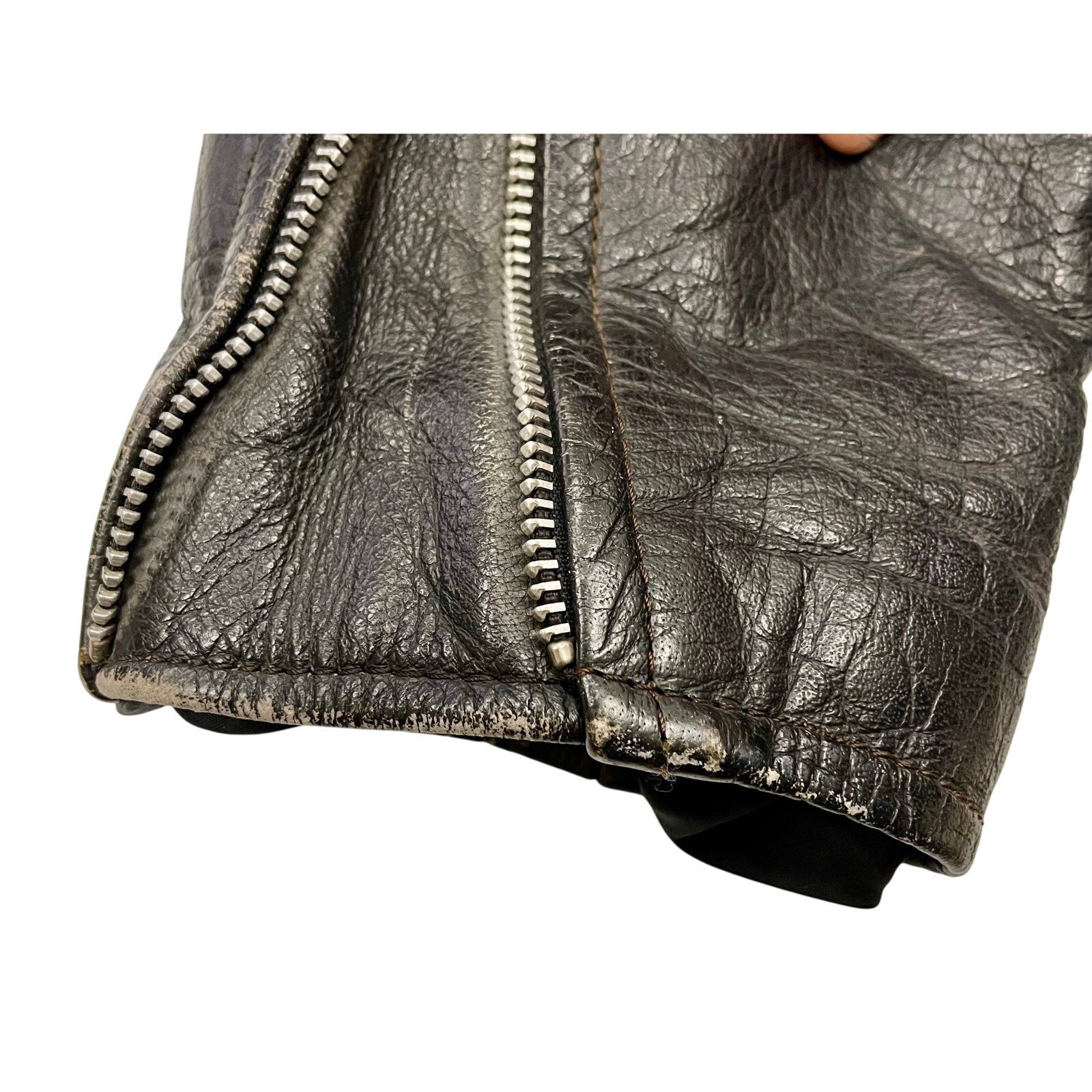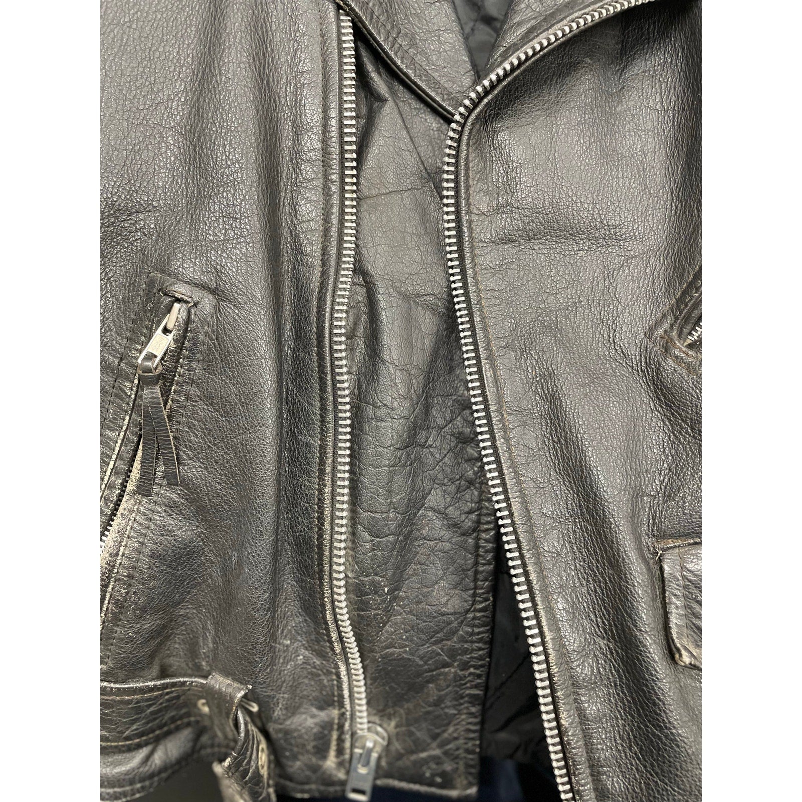 - A vintage First Genuine Leather Moto Jacket Size 44 black. Includes vintage Harley Davidson pins and patches. All zippers and snaps work.