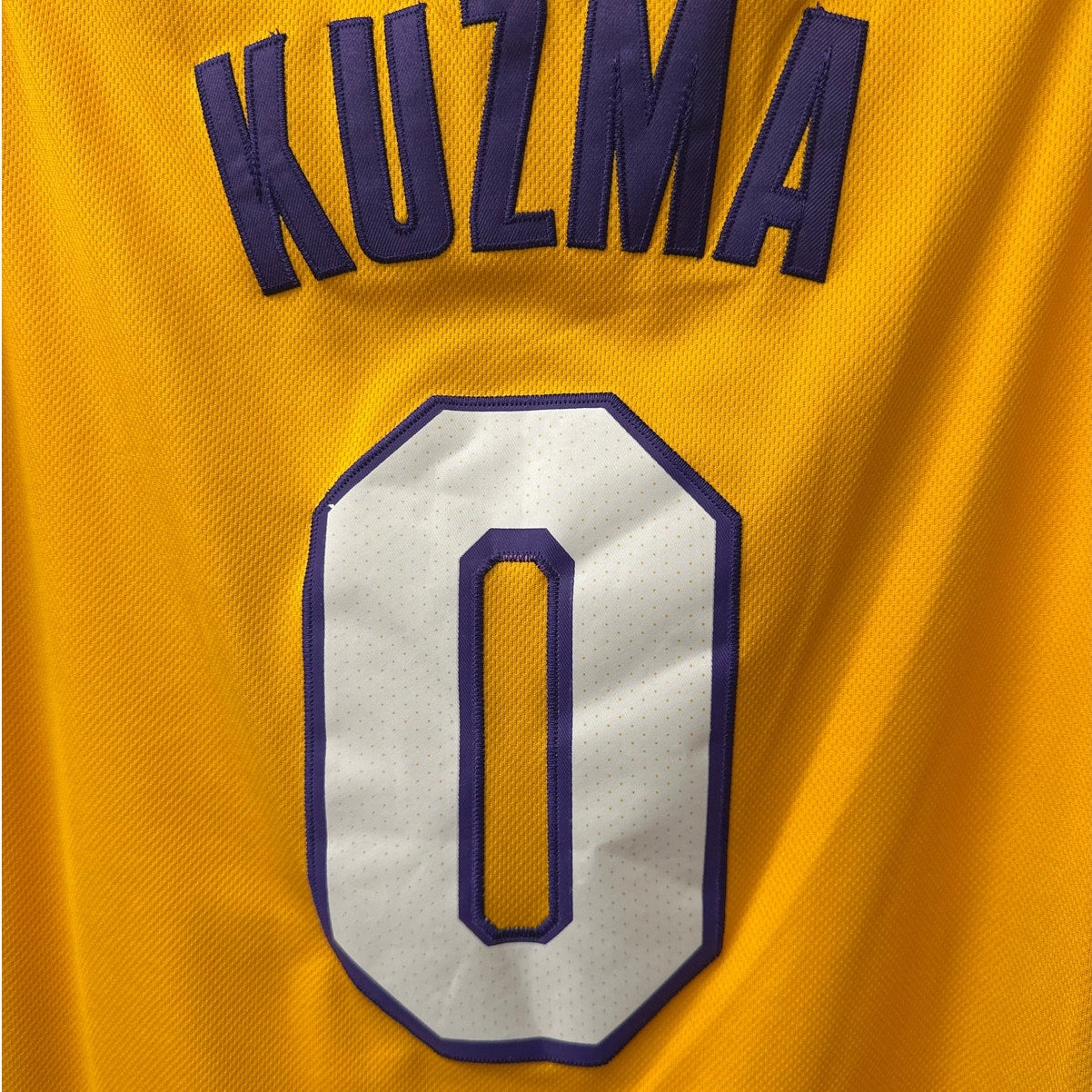 Official Nike Los Angeles Lakers jersey, gold with purple/white trim. Player: Kyle Kuzma #0. Features stitched Nike swoosh, “Wish” sponsorship patch, and NBA logo. Size 50 with Length +4 (engineered to NBA player specs). Gently preowned, excellent condition—no flaws noted.