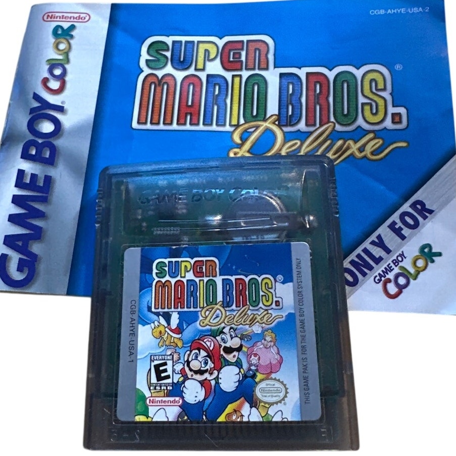 Authentic Nintendo Game Boy Color Super Mario Bros. Deluxe cartridge with original manual included. Game has been tested and works properly. Manual shows some wear from use but is still in pretty good condition overall. A great addition for collectors or anyone looking to replay a classic Mario platformer.