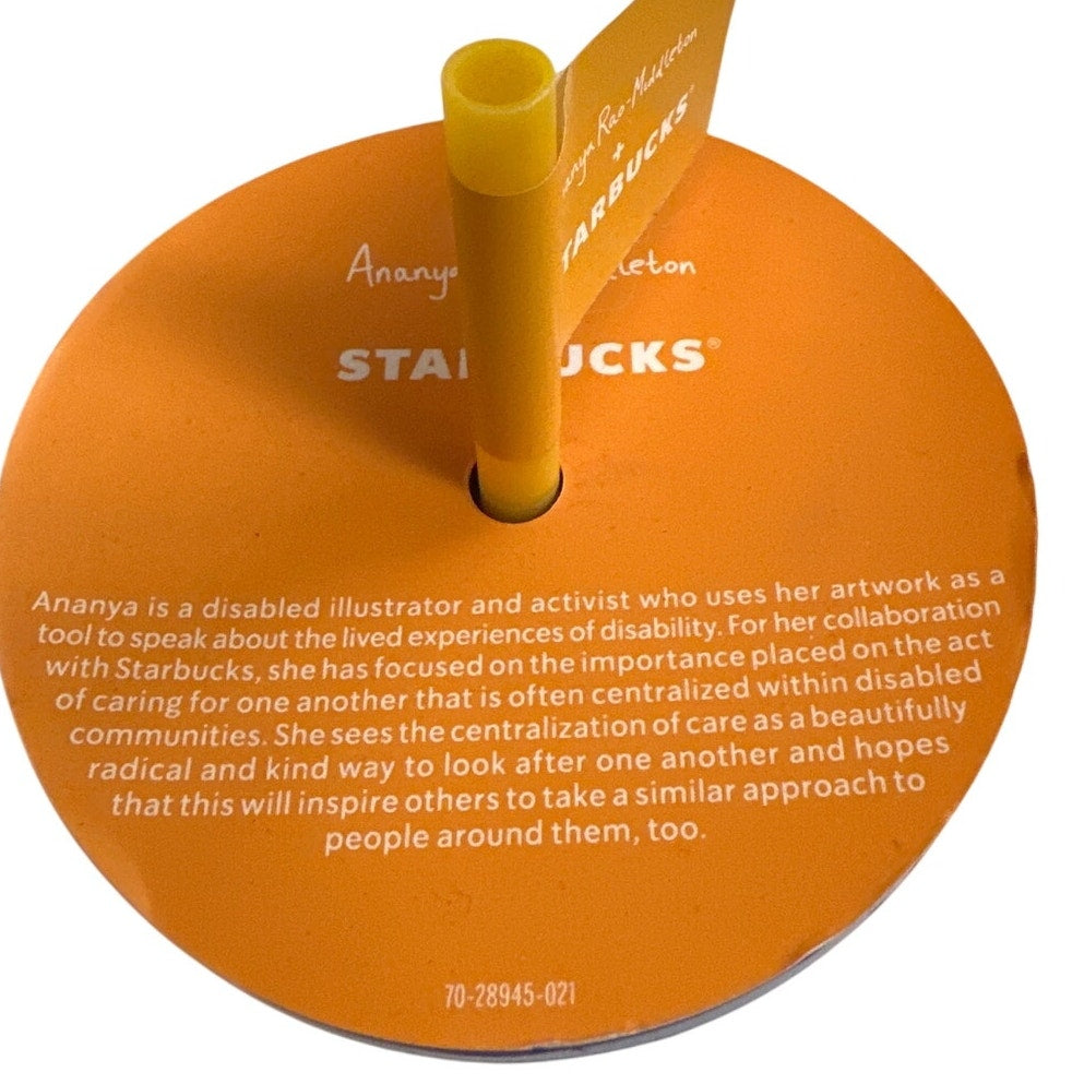 2024 Starbucks Artist Collab with Ananya Rao‑Middleton. 24 oz holographic cold cup tumbler featuring vibrant, inclusive artwork and “Care in Community” messaging. Brand new, but has some rub marks and scuffing (see photos) Includes original tag/flag. Holds 24 oz, reusable straw, perfect for cold drinks. Symbolism highlights disability community care.