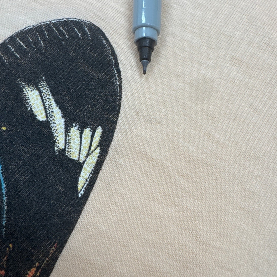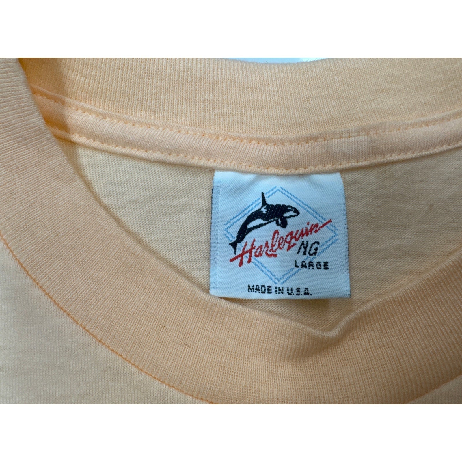Rare vintage Harlequin brand t-shirt featuring vibrant butterfly graphics front & back. Made in USA, salmon/peach color, single stitch. Tagged size Large. Measures pit to pit 20”, length 31”. Pre-owned with light stains near hem and a small snag on back right sleeve (see photos). Still a beautiful collectible vintage nature graphic tee!