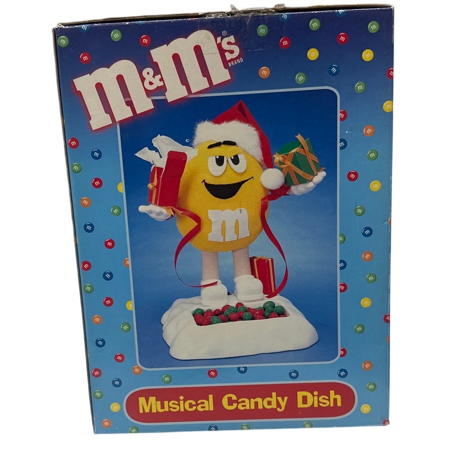 -M & M’s musical candy dish. Very rare, hard to find. Still in box with straps and original packaging. Box lists 18 Christmas melodies.