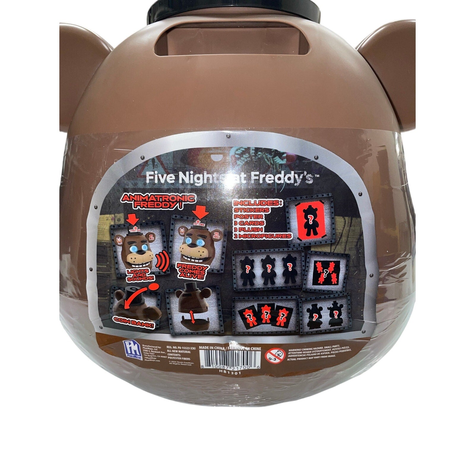 - New unopened Five Nights At Freddy’s 10th anniversary animatronic Freddy head capsule/coin bank. Item features function properly. Includes mystery packs inside. Item is new with some scratches from storage. Please see photos carefully.
