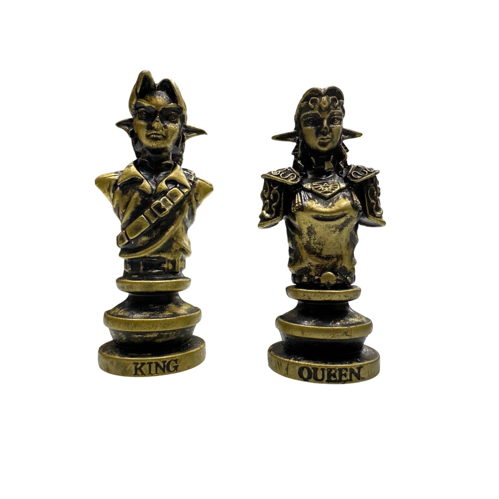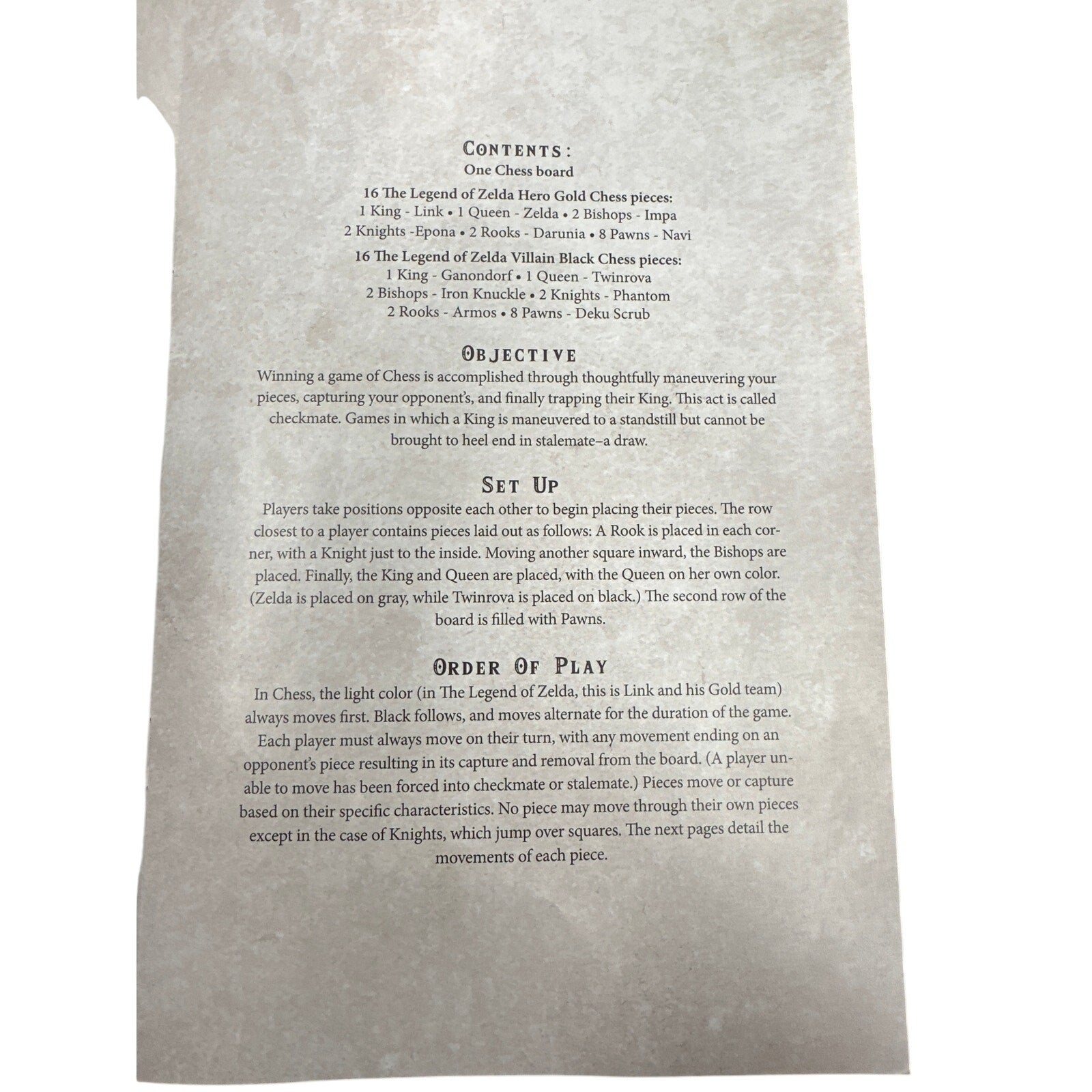 - Features 32 custom legend of Zelda figurine chess pieces made out of vinyl. The Hero pieces are headed by Link : Zelda herself is the Queen, while impa, epona, and darunia are bishops, Features Premium styled window packaging with magnetic front closure. Figures 2”-3”. Board 20” x 16.5”. This is a complete set. Nintendo and USAopoly.