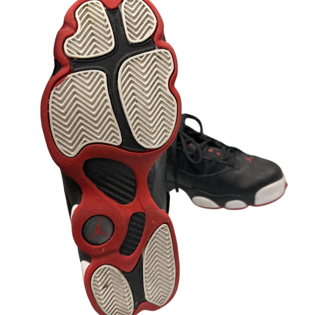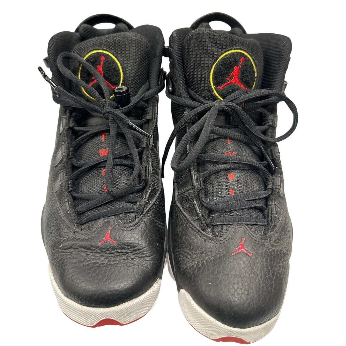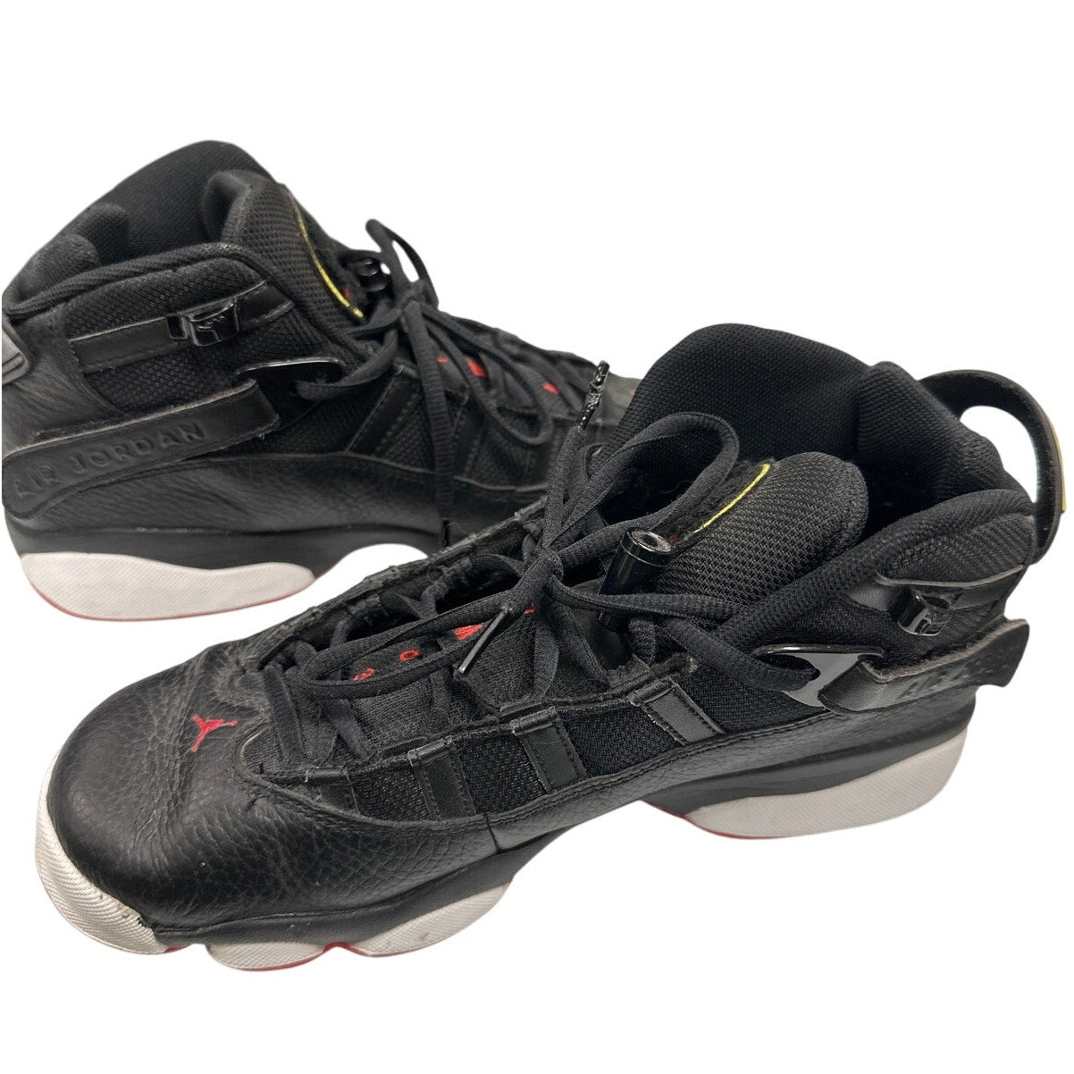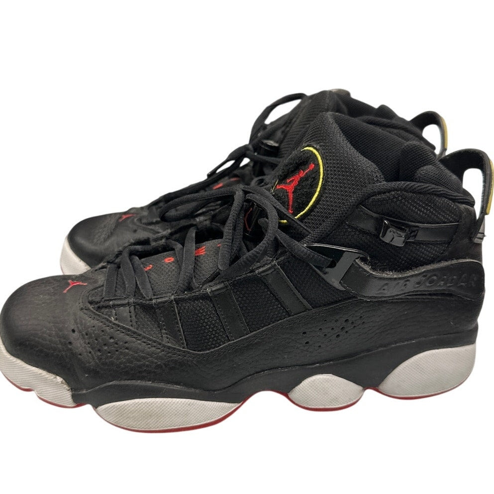 This classic black sneaker by Nike, known as the Air Jordan 6 Rings 'His Airness', is a must-have for any sneaker enthusiast. This is the black/varsity red/white colorway. The design features a red accent and the iconic Jumpman logo, making it the perfect addition to any casual or athletic outfit.