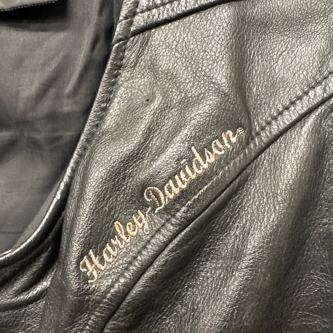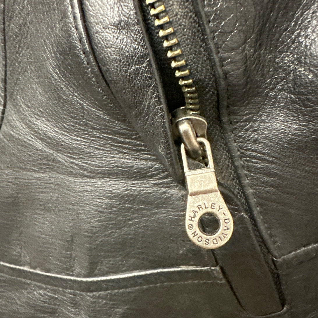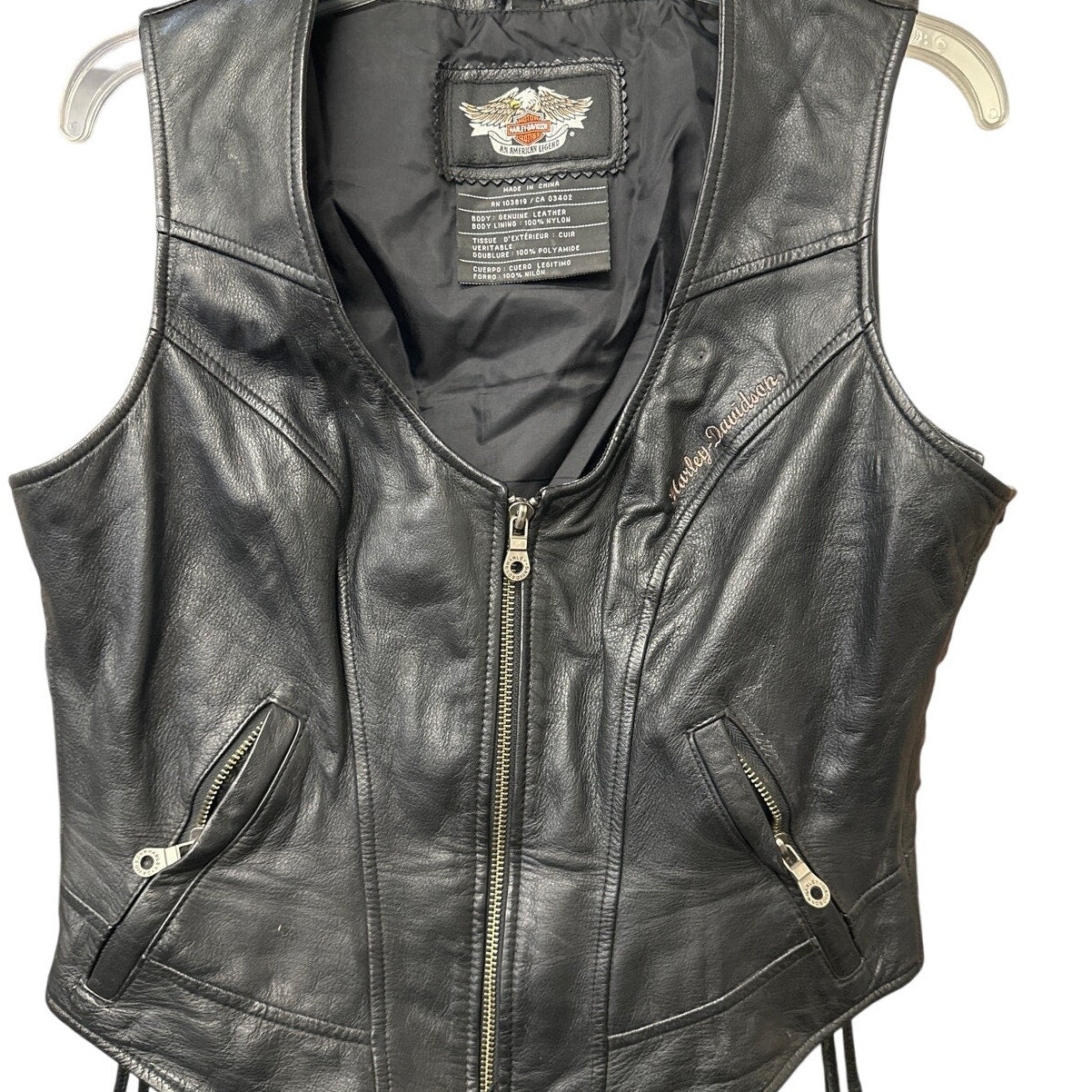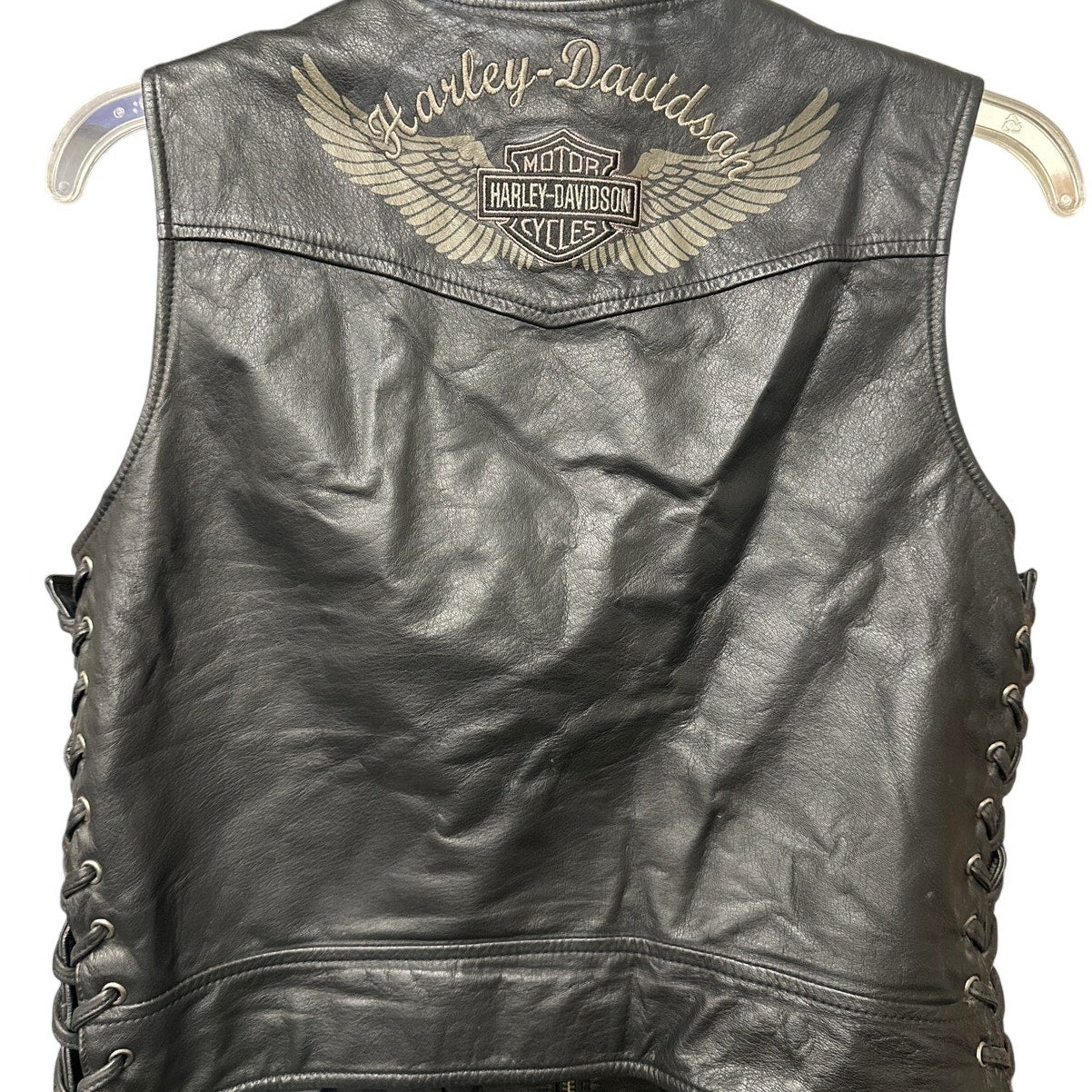 Genuine Harley Davidson black leather vest featuring side lacing, a flattering waist silhouette, and an embroidered “Harley‑Davidson” yoke logo. The 2‑way front zipper and zippered pockets add both functionality and edge. Crafted from mid‑weight leather. Pre‑owned in excellent condition, minimal signs of wear.