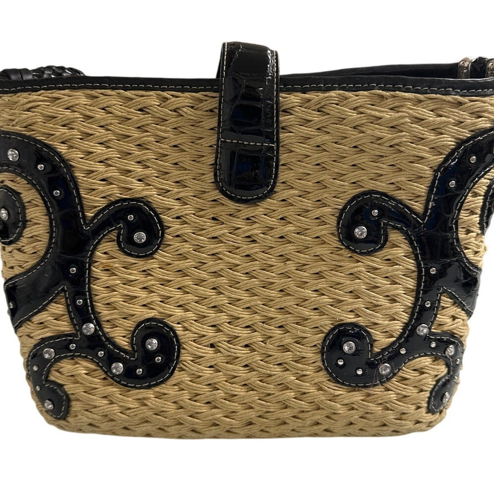 Very good preowned condition. Slight wear on bottom and barely noticeable coloring in straw. Authentic Brighton shoulder bag with a western flair. Woven straw body with black faux croc leather trim, braided straps, rhinestone-studded scrollwork, and signature Brighton interior lining. Magnetic snap closure, inner zip pocket, slip pocket, and key clasp. Eye-catching and great for year-round use!