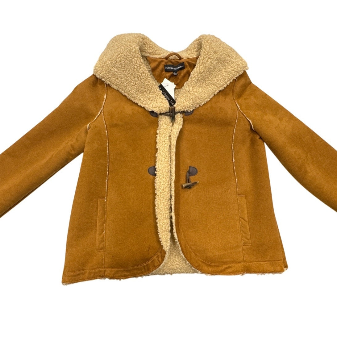 Brand new with tags! Gorgeous camel faux leather coat with cozy cream faux fur lining and hood. Stylish and warm—perfect for fall and winter. Women’s size Large. Pit to pit 20”, length 26”. Excellent quality and condition