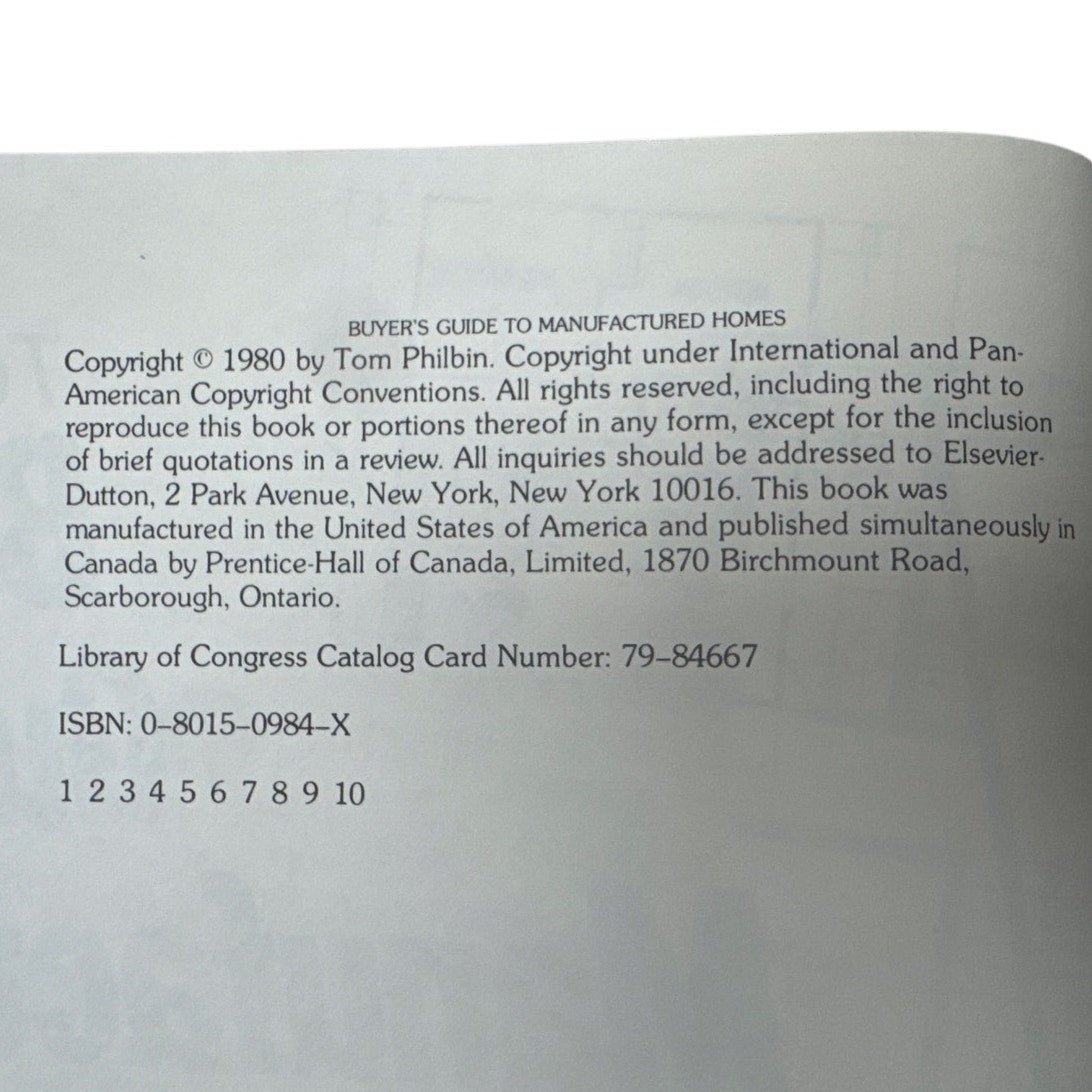 First Edition Buyer’s Guide to Manufactured Homes by Tom Philbin. ISBN 0-8015-0984-X. Dust jacket shows wear with faded blue and worn edges; inner flaps and hardcover edges have yellowing from age. Pages are clean with normal age toning; last section has heavier yellowing. No writing or tears noted. Great reference book for manufactured home layouts, buying tips, and construction info.