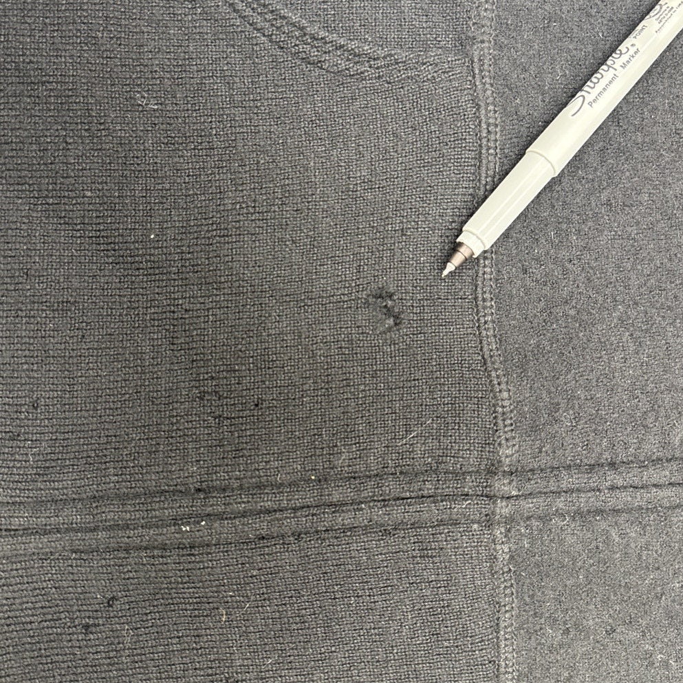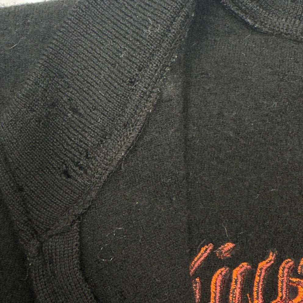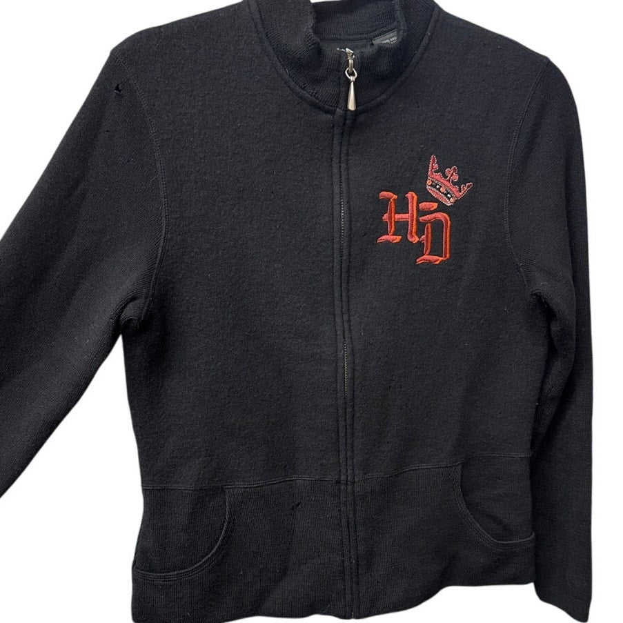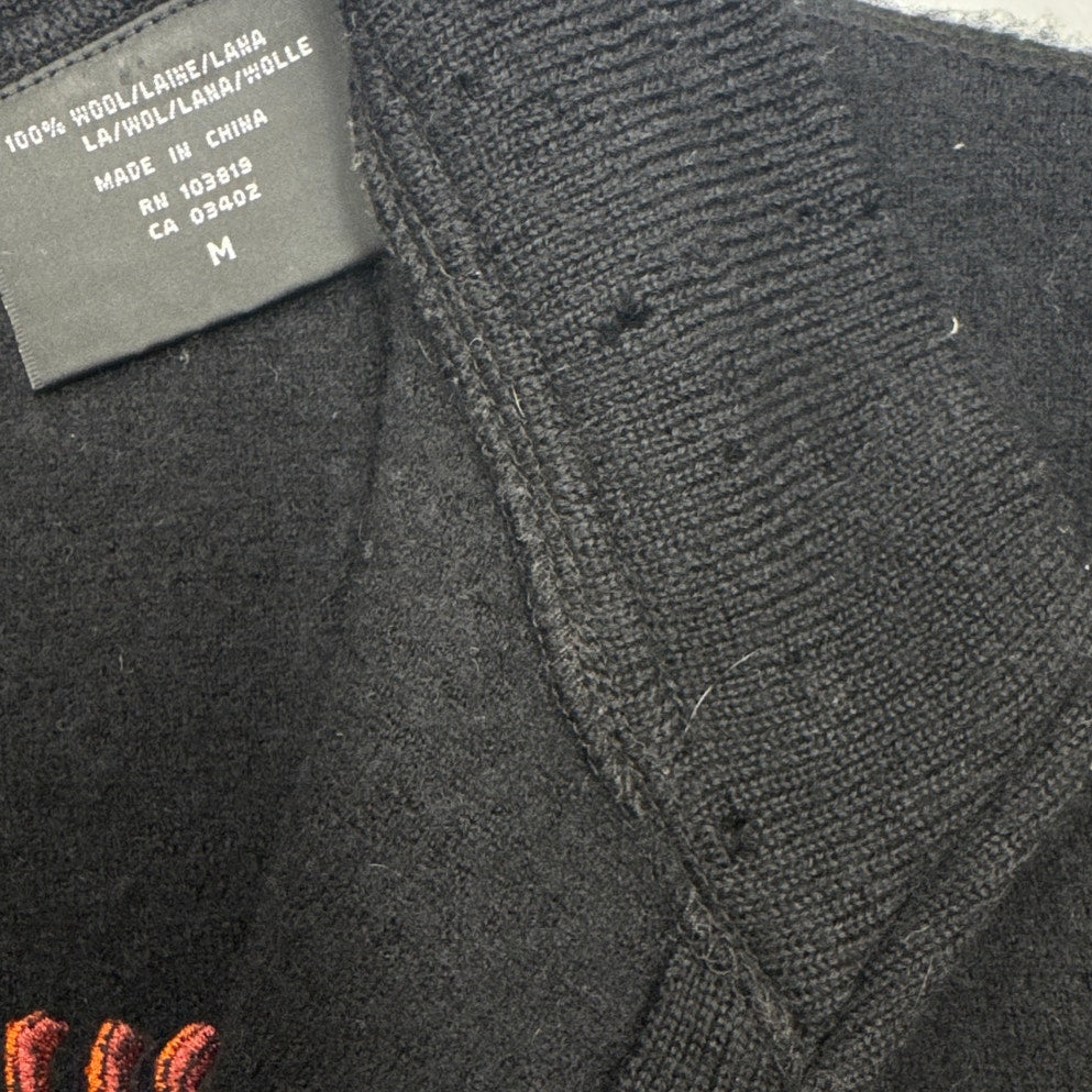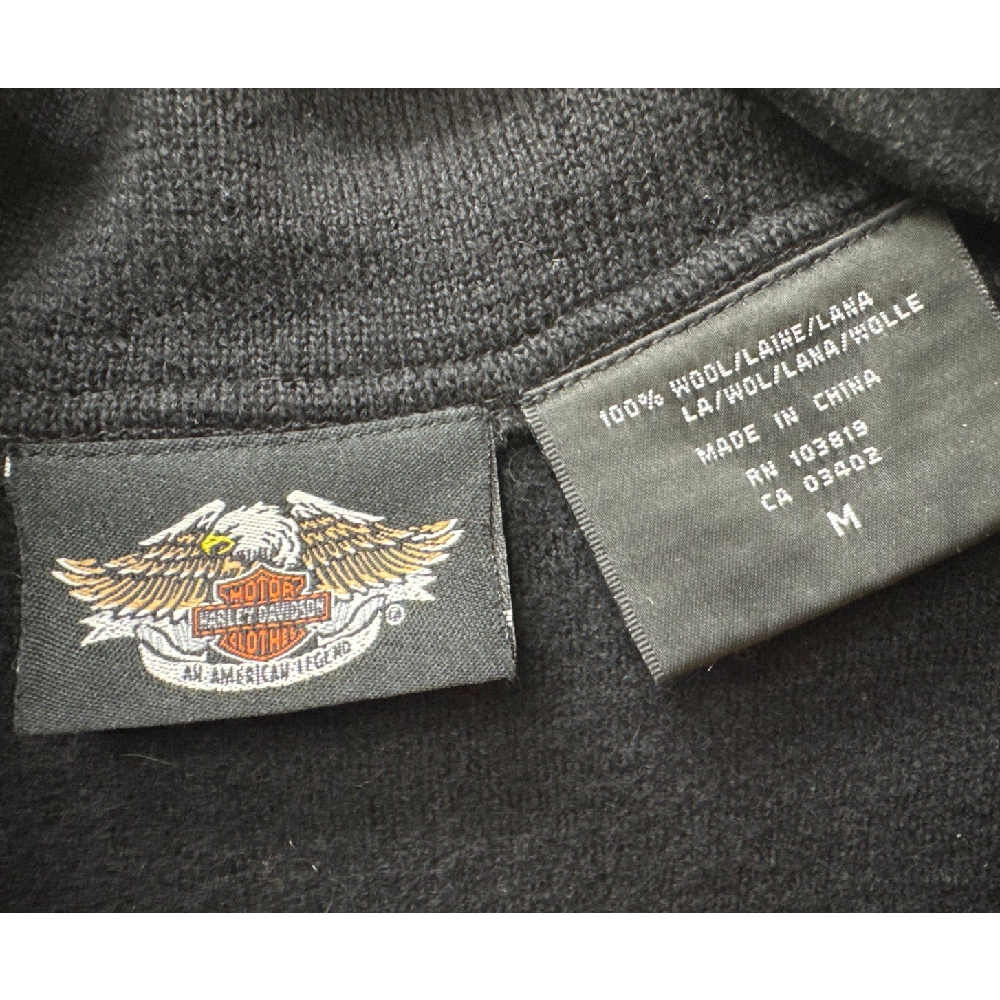 Harley Davidson Cycle Queen black wool sweater (women’s medium). Pit to pit 17”, length 23”. Pre-owned with small holes throughout—mostly on sleeve ends & bottom front, plus some inside collar wear. True vintage wool character.