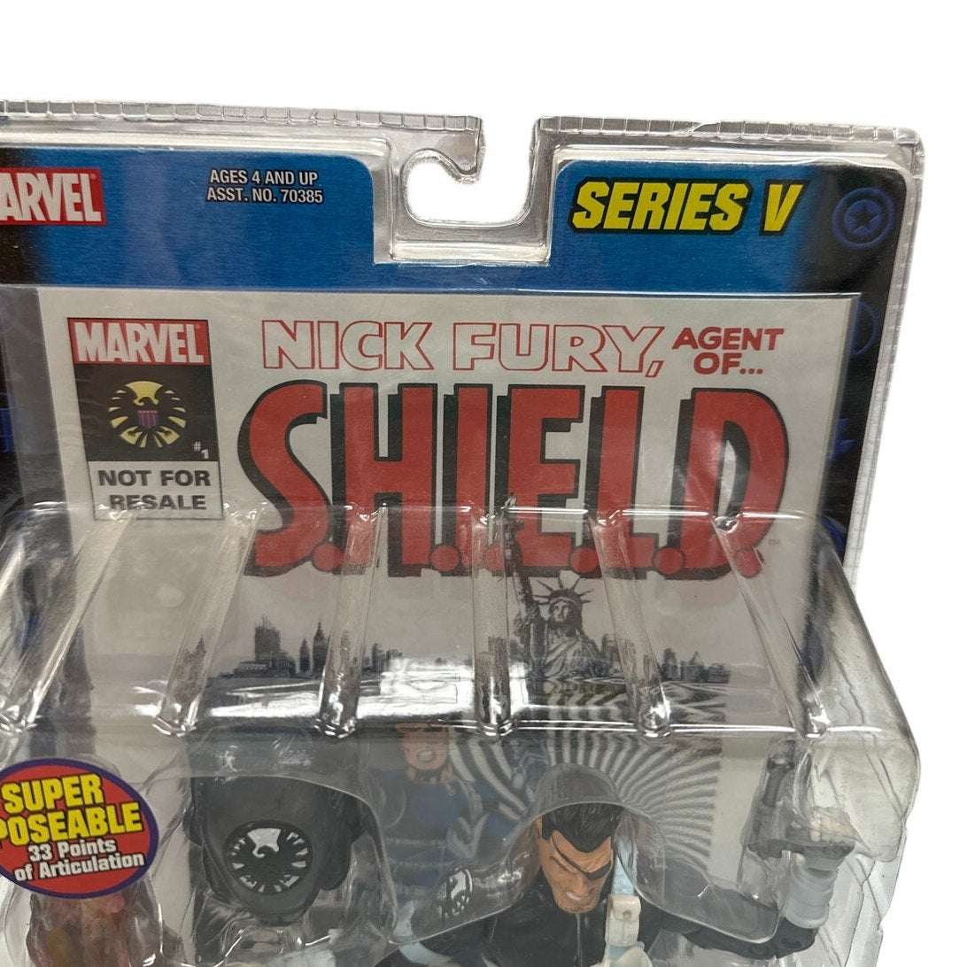 Vintage Marvel Legends Series V Nick Fury (Toy Biz, 2003). Includes bonus 32-page comic & wall-mountable display stand. Sealed, package is in excellent condition—no yellowing or bending. Slight dent on bottom right of clamshell. Great for Marvel or Nick Fury collectors.