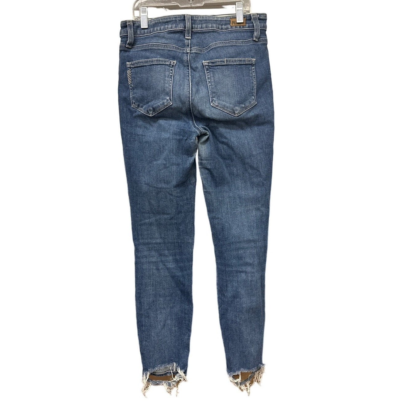 -Paige jeans Hoxton Crop size 26, color blue with some rips at bottom of legs. Otherwise great condition pre owned. Normal retail prices for Paige jeans are $150+. Measures 28” waist and 35” long.