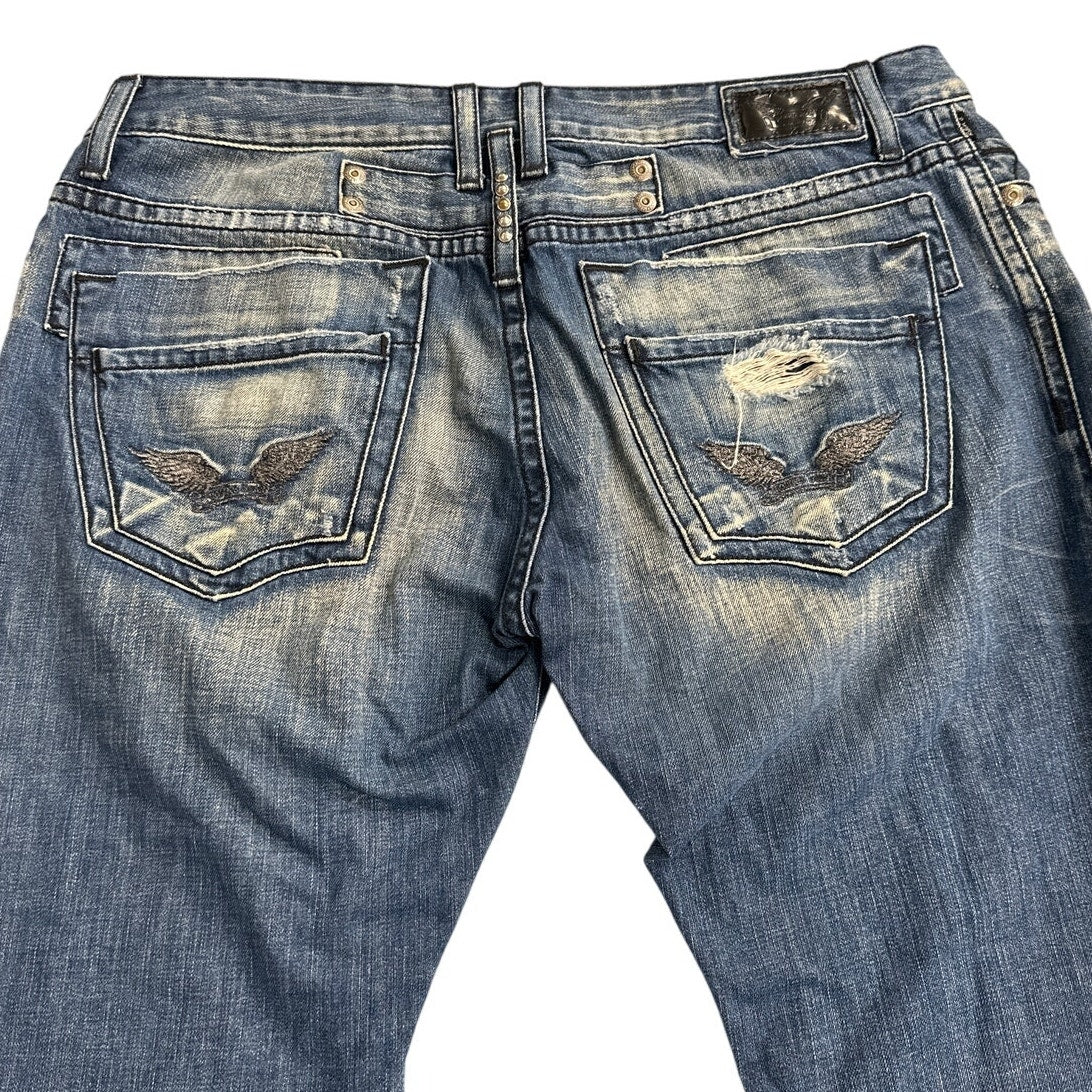 Robin’s Jeans distressed denim with signature wing embroidery. Biker-chic style, made in the USA. Heavy distressing, faded whiskering, back flaps, and winged pockets. Excellent preowned condition.